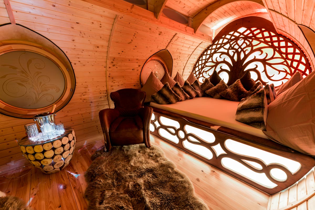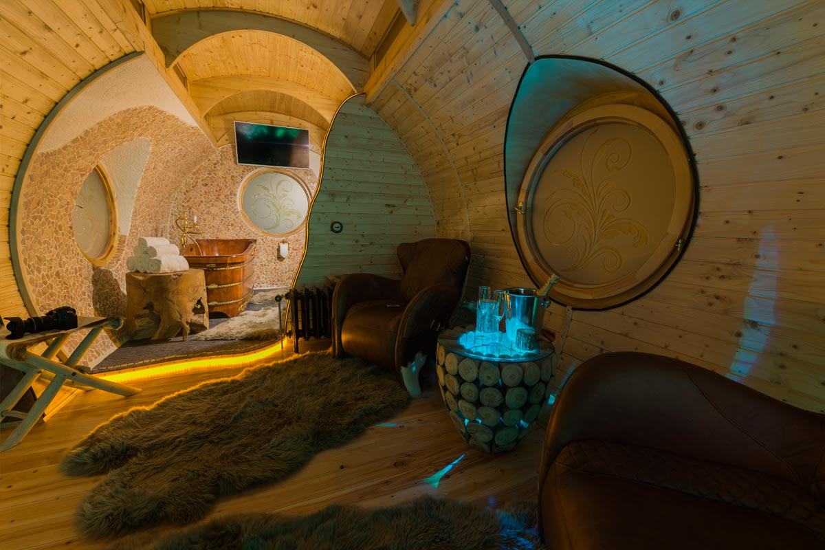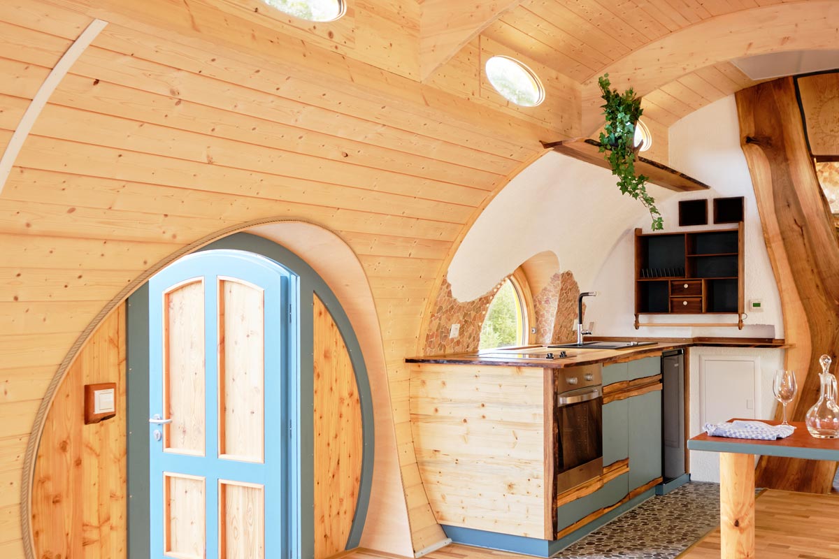 Unsere beiden Hobbitwagen stechen äußerlich optisch sofort ins Auge. Sie sehen besonders schön aus und sind prachtvoll verziert. Im Innenraum sind die Regale hinten im Raum und vorne bei der Tür sehr groß und auch geräumig. Das Büro ist gut angepasst und die Schränke reichen auch völlig aus, sodass man im Hobbitwagen alles gut verstauen kann. Die Rundbauwagen sind sehr lichtdurchflutet, durch die vielen großen Fenster. Die Küche funktioniert ebenfalls reibungslos.